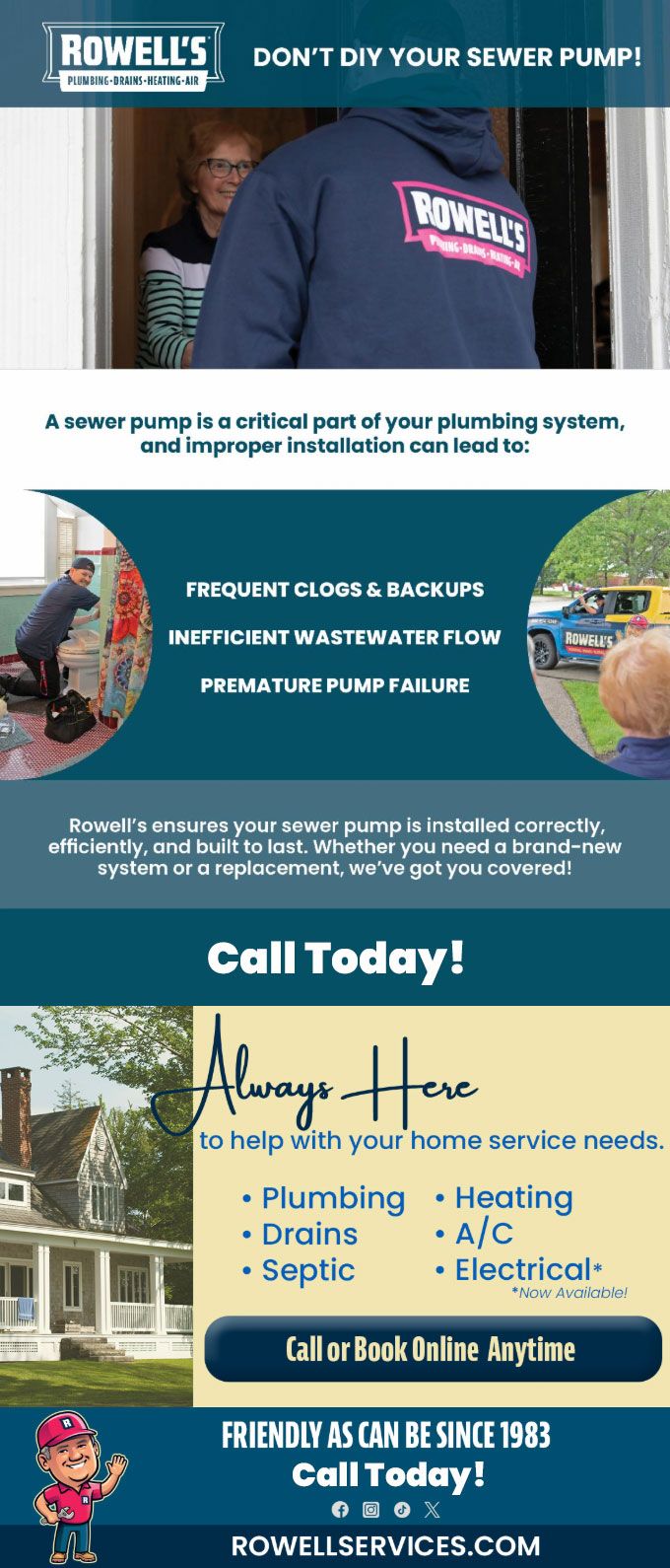 "Friendly As Can Be Since 1983!" When you need help with your plumbing, drains, heating, cooling or electrical in Salisbury, you can always rely on Rowell's Services! Call us now or book online!
